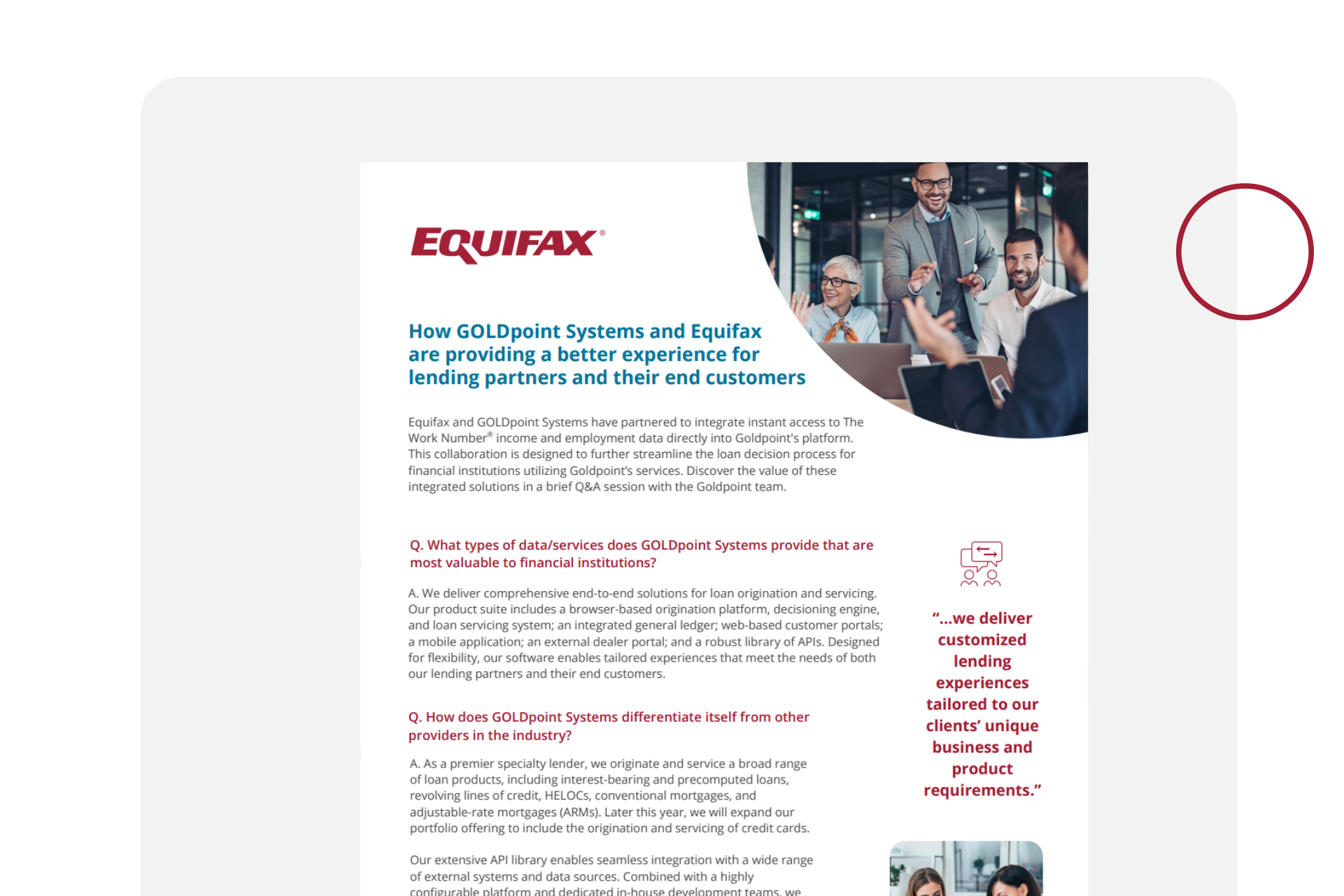 The Work Number® income and employment data is now available through Goldpoint's platform. This collaboration is designed to further streamline the loan decision process for financial institutions utilizing Goldpoint’s services. Discover the value of these integrated solutions in a brief Q&A session with the Goldpoint team.